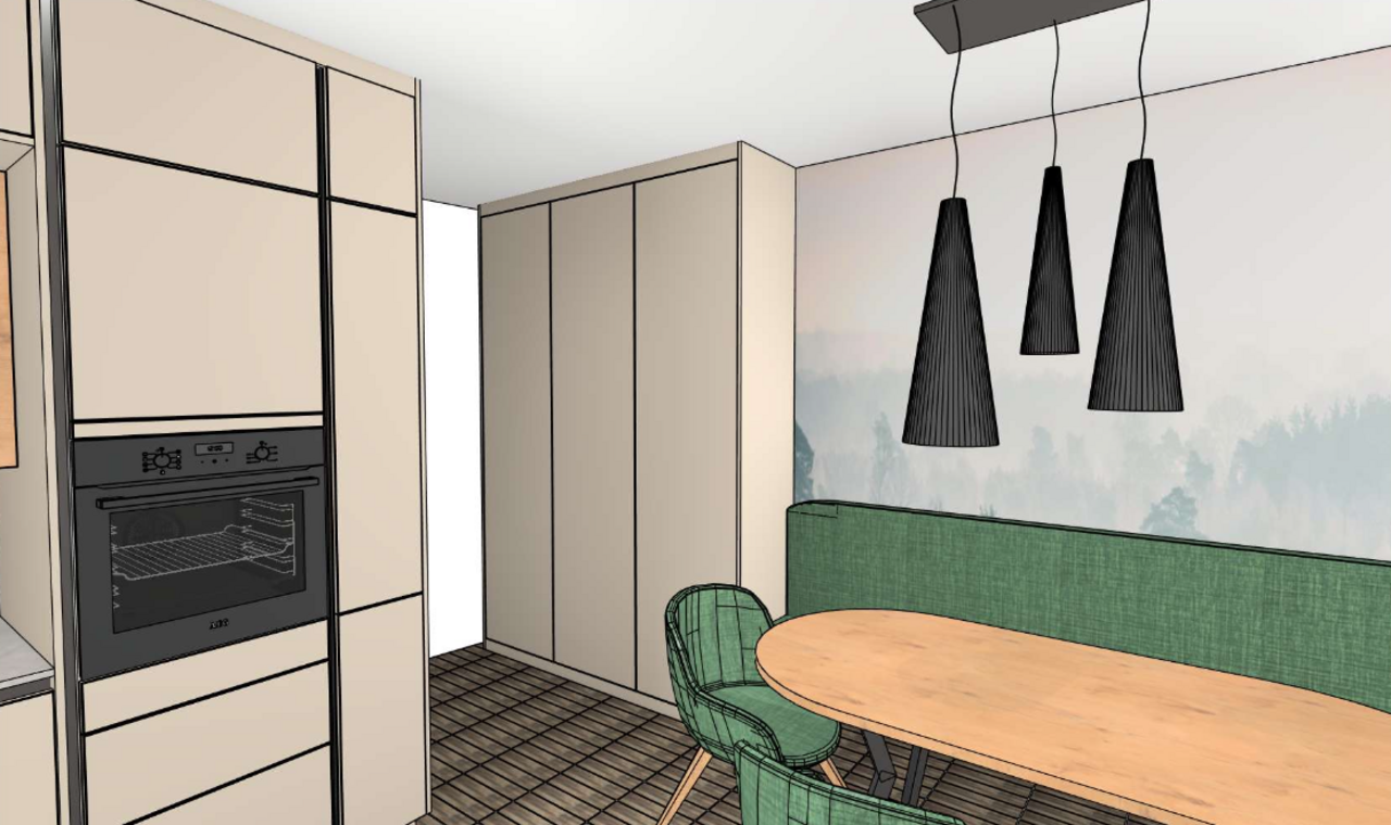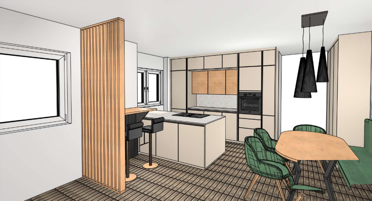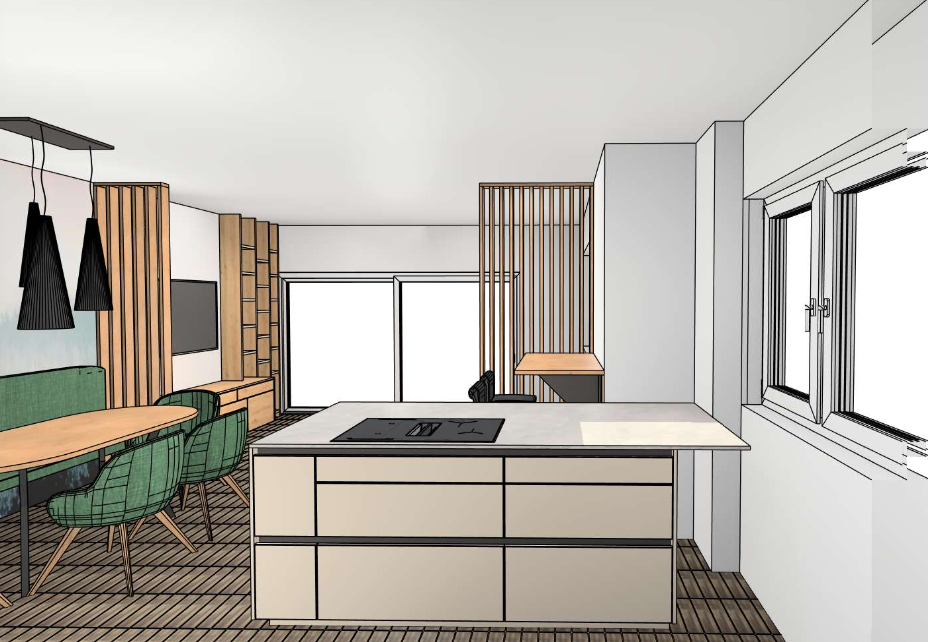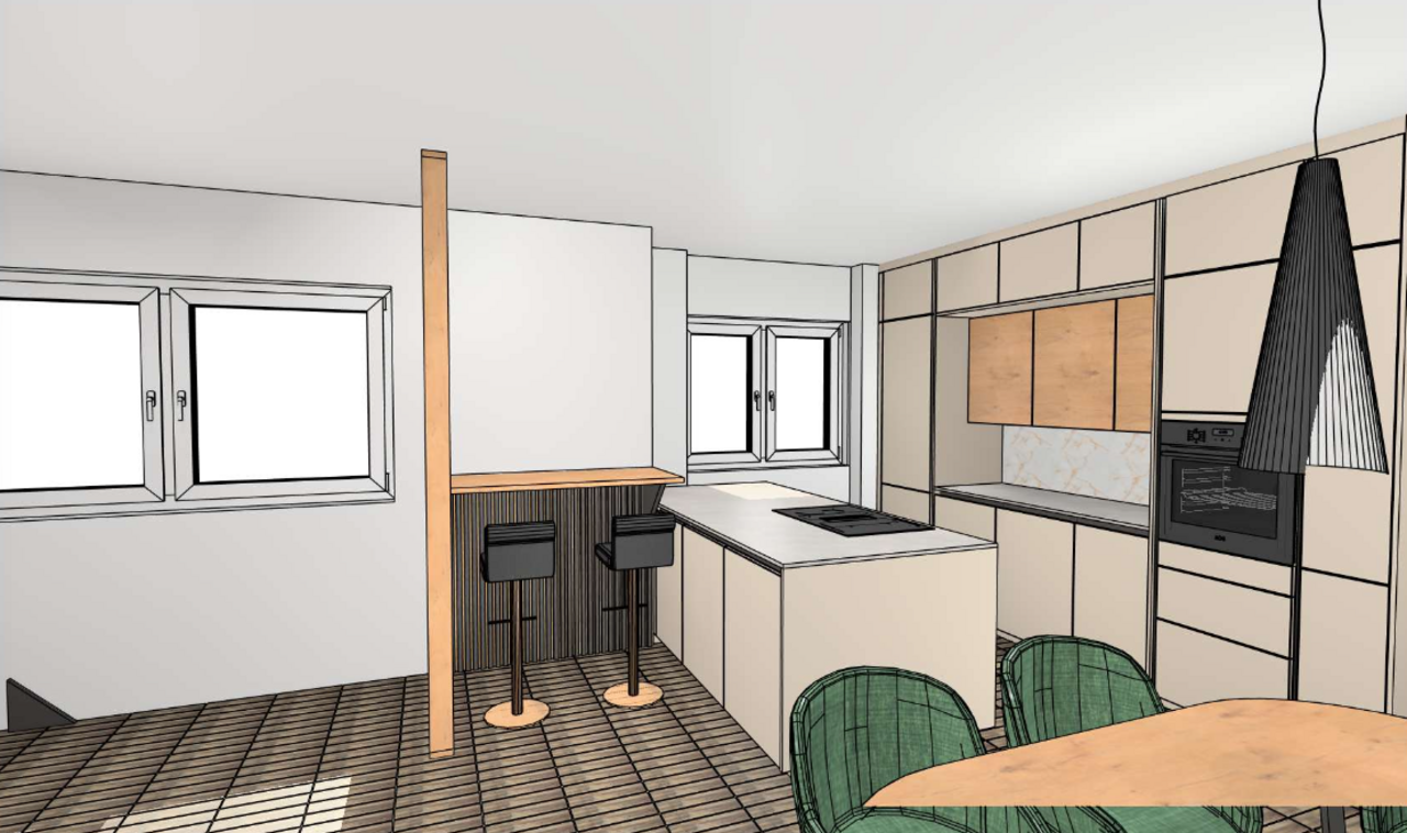 - Küchenbereich mit hochwertiger Küche, E-Geräten und einer Terrassentüre